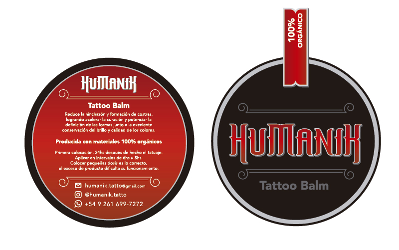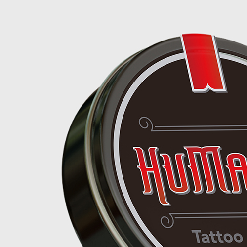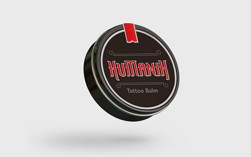 La marca Humanik comercializa cremas para cuidado de tatuajes recién realizados. Para el diseño de la marca se basó en lenguaje tipográfico identificatorio de este mundo, buscando destacar esos rasgos con el manejo de sombras y espesores simulados.