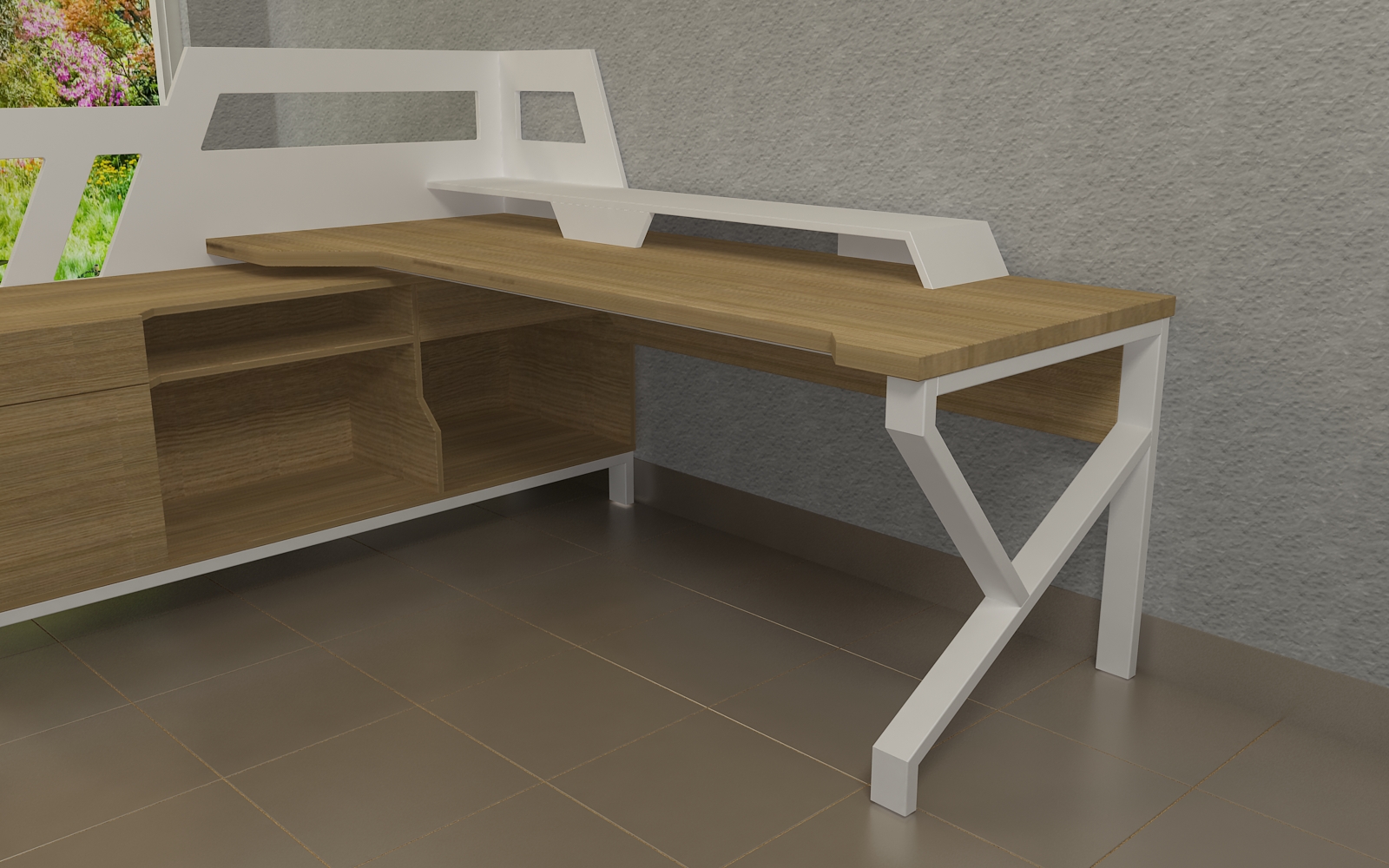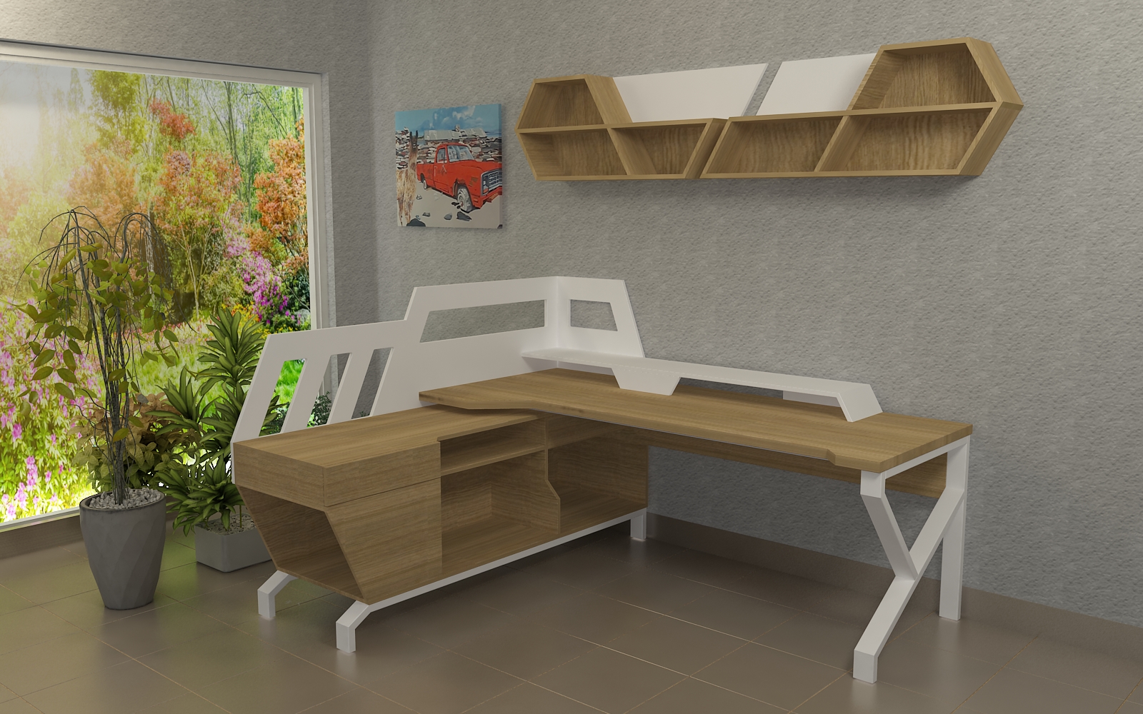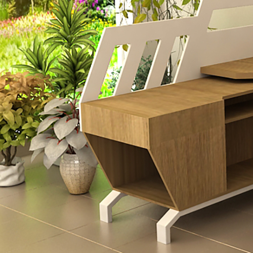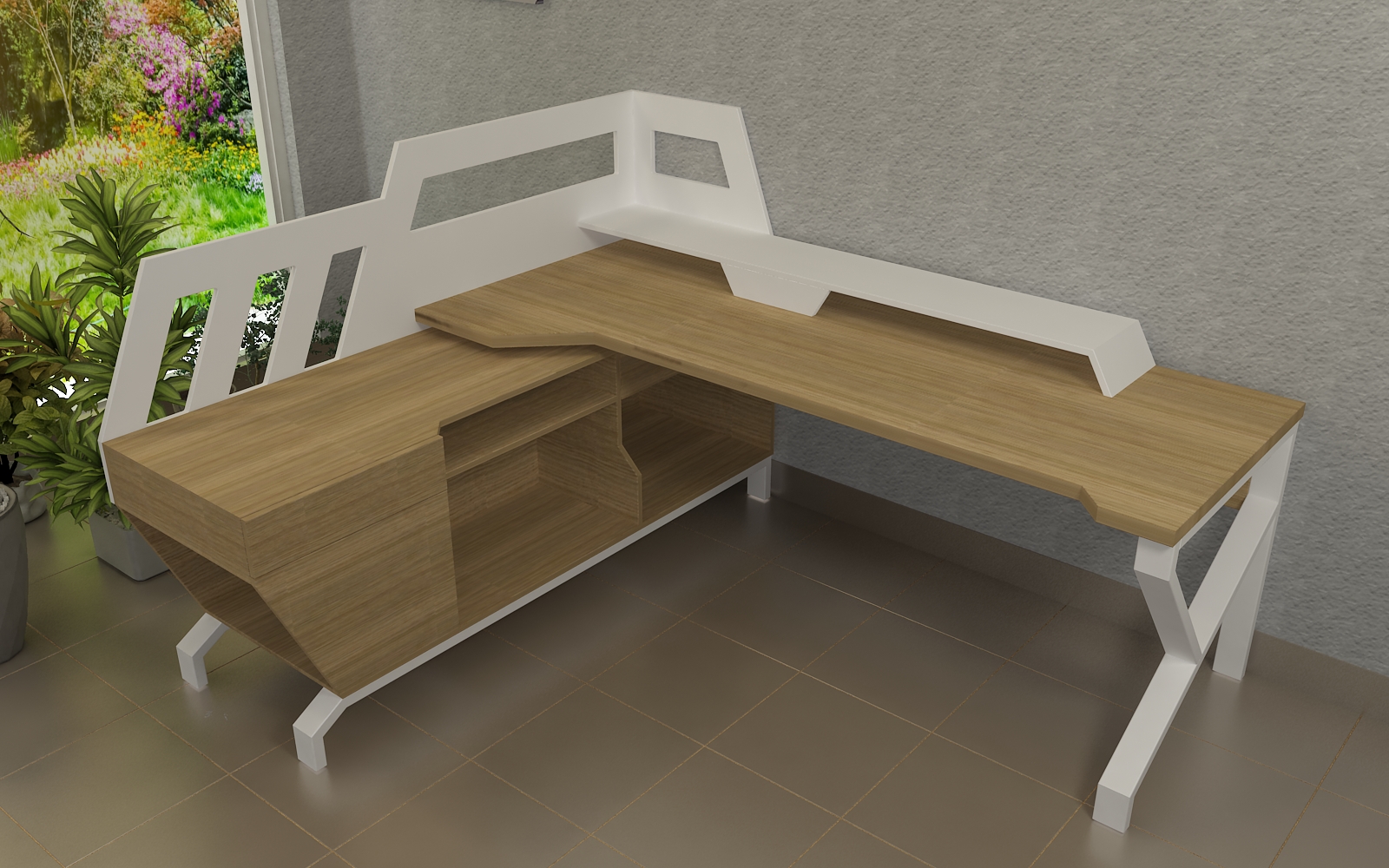 La configuración del mueble incluye una amplia superficie de apoyo combinada en forma de L con un mueble auxiliar. Además, cuenta con una pantalla a media altura que proporciona privacidad mientras permite que la luz natural y las plantas del entorno exterior invadan el espacio, creando un ambiente acogedor y luminoso. Las repisas, diseñadas para consolidar la estética sci-fi, ofrecen un lugar perfecto para la colección de libros y objetos de colección del cliente, integrando funcionalidad y estilo en una sola pieza.