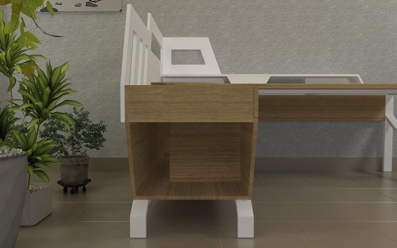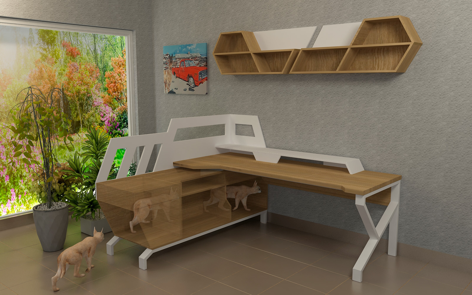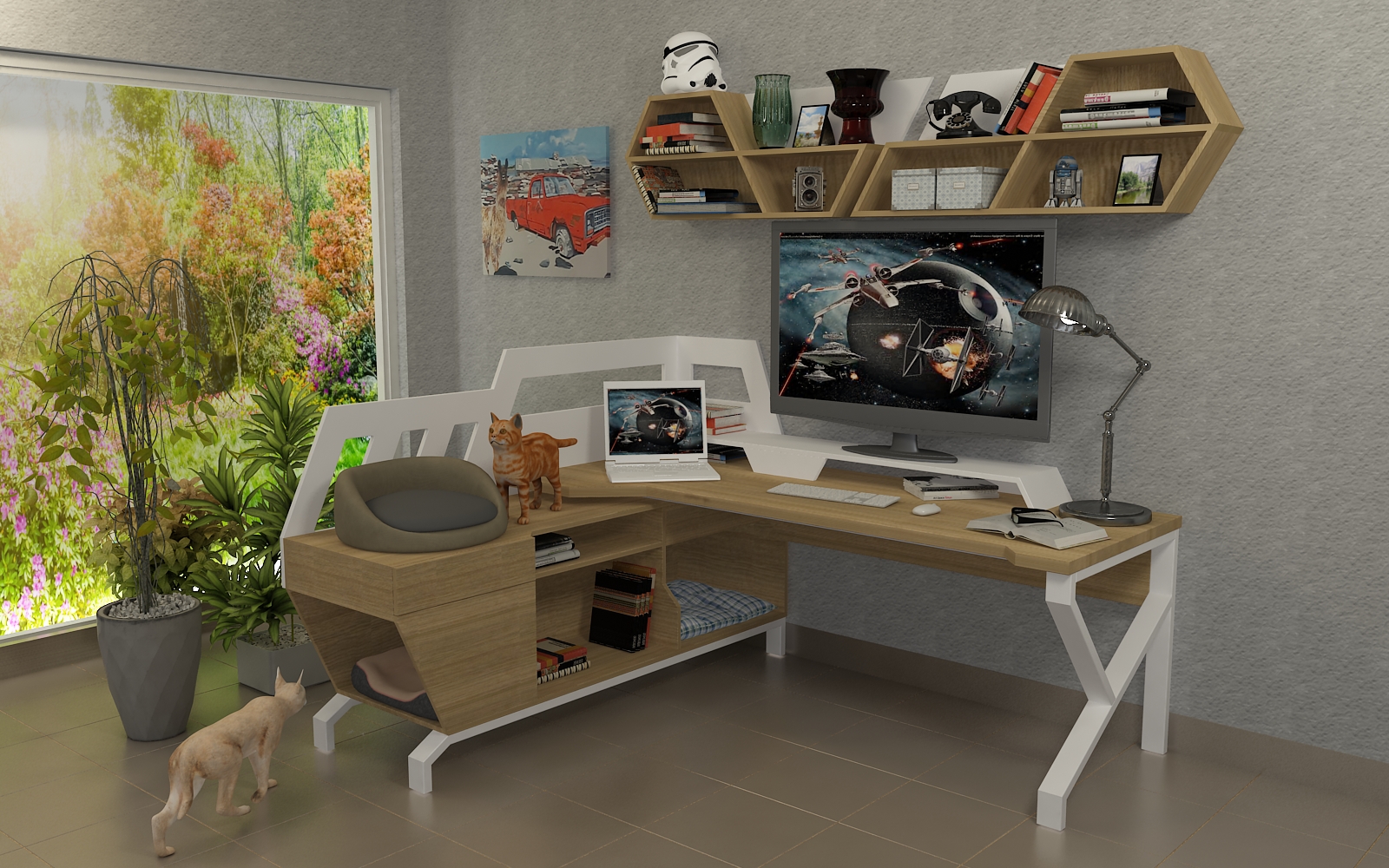 La configuración del mueble incluye una amplia superficie de apoyo combinada en forma de L con un mueble auxiliar. Además, cuenta con una pantalla a media altura que proporciona privacidad mientras permite que la luz natural y las plantas del entorno exterior invadan el espacio, creando un ambiente acogedor y luminoso. Las repisas, diseñadas para consolidar la estética sci-fi, ofrecen un lugar perfecto para la colección de libros y objetos de colección del cliente, integrando funcionalidad y estilo en una sola pieza.
