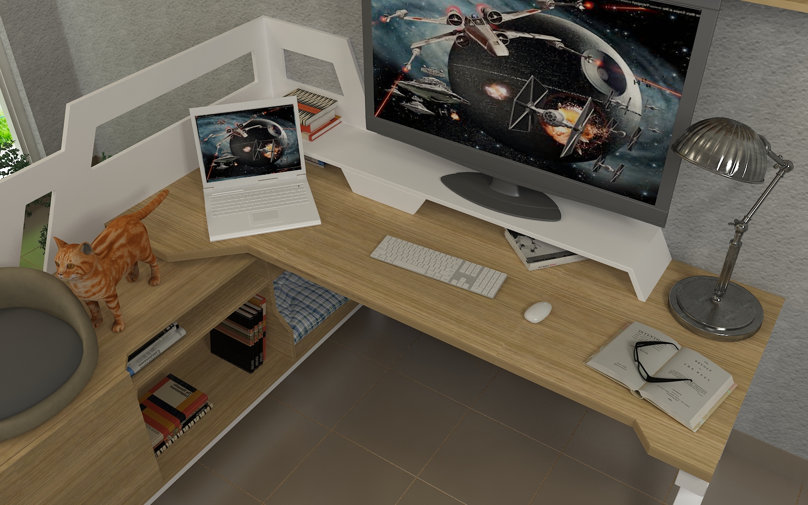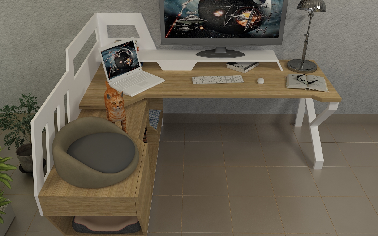 Nos enorgullece presentar uno de nuestros proyectos más innovadores: una pieza de mobiliario diseñada con una temática sci-fi inspirada en Star Wars y Star Trek, que además incluye un espacio especial para las mascotas del cliente, en particular sus gatos. Este diseño multifuncional no solo ofrece dos áreas cómodas para que los gatos reposen, sino también un canal interno en el mueble lateral para que jueguen y se trasladen, aprovechando su tendencia a explorar lugares estrechos y oscuros.